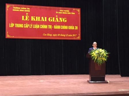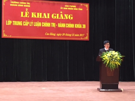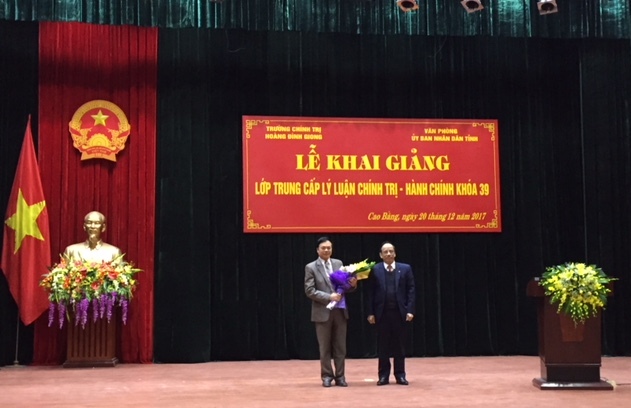 Ngày 20 tháng 12 năm 2017, Trường Chính trị Hoàng Đình Giong phối hợp với Văn phòng UBND tỉnh Cao Bằng tổ chức khai giảng Lớp Trung cấp lý luận chính trị - hành chính khóa 39. Dự lễ khai giảng về phía lãnh đạo tỉnh có đồng chí Trịnh Hữu Khang, Phó Chủ tịch UBND tỉnh Cao Bằng; đại diện lãnh đạo Sở Nội vụ, Sở Kế hoạch - Đầu tư tỉnh Cao Bằng, Văn phòng UBND tỉnh; về phía Nhà trường có đồng chí Nông Văn Tiềm, Phó Bí thư Đảng ủy, Phó Hiệu trưởng; đồng chí Tô Vũ Ninh, Phó Hiệu trưởng; lãnh đạo các khoa phòng, cùng các thầy giáo, cô giáo trong nhà trường và 75 học viên là cán bộ công chức, viên chức thuộc khối tham mưu Văn phòng UBND và một số sở ngành của tỉnh.