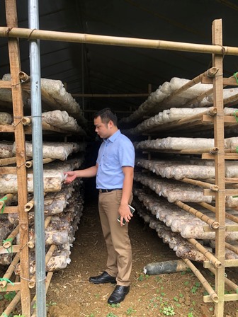Đ/c Đàm Ngọc Nguyễn - giảng viên khoa Xây dựng Đảng tham quan, tìm hiểu mô hình trồng nấm tại xóm Pác Măn, thị trấn Nguyên Bình