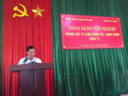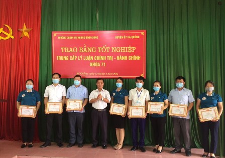Ngày 13/8/2021, Trường Chính trị Hoàng Đình Giong phối hợp với Huyện ủy Hà Quảng tổ chức trao Bằng tốt nghiệp cho 78 học viên lớp Trung cấp lý luận chính trị - hành chính khóa 71. Đến dự và làm việc tại buổi trao bằng tốt nghiệp có đồng chí Triệu Thanh Sơn- Phó Bí thư Thường trực Huyện ủy; đồng chí Nông Hoàng Hùng- Phó Bí thư Đảng ủy, Phó Hiệu trưởng Trường Chính trị Hoàng Đình Giong; các đồng chí lãnh đạo đại diện các ban xây dựng Đảng, Văn phòng Huyện ủy, Phòng Giáo dục của huyện; có đại diện lãnh đạo các phòng, khoa giảng dạy của Nhà trường; phóng viên Đài Truyền thanh - Truyền hình của huyện.
