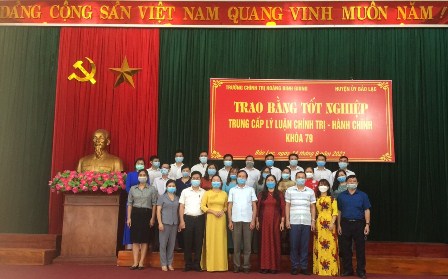 Ngày 14/9/2021, Trường Chính trị Hoàng Đình Giong tỉnh Cao Bằng phối hợp với Huyện ủy Bảo Lạc tổ chức tổng kết, trao Bằng tốt nghiệp cho học viên Lớp Trung cấp lý luận chính trị - hành chính khóa 79. Tham dự tổng kết có đại diện Ban Giám hiệu, các phòng, khoa của Trường Chính trị Hoàng Đình Giong; Đại diện Thường trực Huyện ủy, HĐND, UBND, UBMTTQ; đại diện các phòng, ban có liên quan của huyện Bảo Lạc và 20 học viên đại diện cho lớp học.