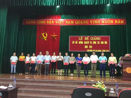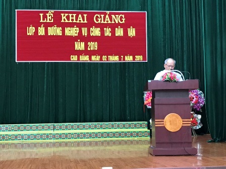 Sau 08 ngày học tập, trao đổi và nghiên cứu, lớp học đã kết thúc nội dung, chương trình theo kế hoạch. Sáng 09/7/2019, Trường Chính trị Hoàng Đình Giong phối hợp với Ban Dân vận Tỉnh ủy Cao Bằng tổ chức Lễ bế giảng lớp học. Dự Lễ bế giảng có đồng chí Trịnh Thị Ánh Hoa - Bí thư Đảng ủy, Hiệu trưởng Nhà trường; đồng chí Nông Đức Ngọc - Phó trưởng Ban Dân vận Tỉnh ủy; các đồng chí lãnh đạo các phòng chức năng của Ban Dân vận Tỉnh ủy; đại diện các phòng, khoa giảng dạy của Nhà trường và 55 học viên.