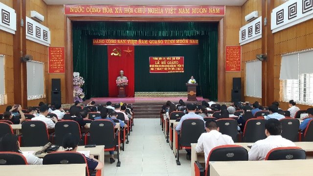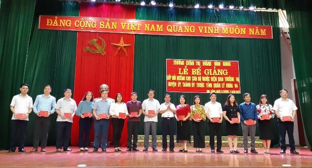 Quang cảnh Lễ Bế giảng Lớp học có 64 học viên là cán bộ, công chức, viên chức của huyện, thành phố và một số xã, thị trấn. Trong thời gian 04 ngày (từ 20 - 24/3/2023), các học viên được học 08 chuyên đề: Tư duy, tầm nhìn của cán bộ lãnh đạo, quản lý về phát triển địa phương; Những giá trị bền vững của chủ nghĩa Mác-Lênin, tư tưởng Hồ Chí Minh trong thời đại ngày nay; Đổi mới mô hình tăng trưởng, cơ cấu lại nền kinh tế trên nền tảng khoa học - công nghệ và đổi mới sáng tạo; Hoàn thiện đồng bộ thể chế phát triển bền vững, trọng tâm là thể chế kinh tế thị trường định hướng xã hội chủ nghĩa ở Việt Nam; Xây dựng, chỉnh đốn Đảng trong sạch, vững mạnh, nâng cao năng lực lãnh đạo, cầm quyền của Đảng trong giai đoạn hiện nay; Xây dựng và phát triển văn hóa, con người Việt Nam trong giai đoạn mới; Công tác phòng, chống tham nhũng, công tác dân tộc, tôn giáo ở địa phương hiện nay; Thực hiện chuyển đổi số quốc gia và thực tiễn địa phương.