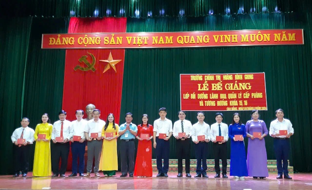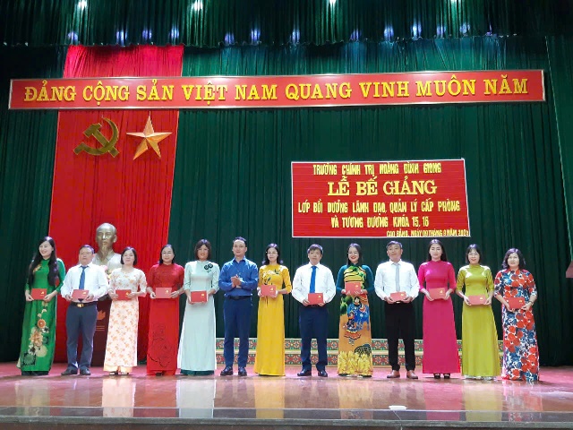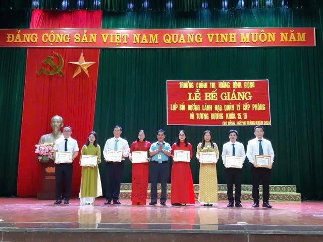 Ngày 09/9/2024, Trường Chính trị Hoàng Đình Giong tổ chức Lễ Bế giảng lớp Bồi dưỡng đối với lãnh đạo, quản lý cấp phòng và tương đương khóa 15, 16 cho 80 học viên (khóa 15 có 39 học viên; khóa 16 có 41 học viên). Dự Lễ bế giảng có các đồng chí Đảng ủy, Ban giám hiệu, đại diện lãnh đạo các khoa, phòng của Nhà trường.