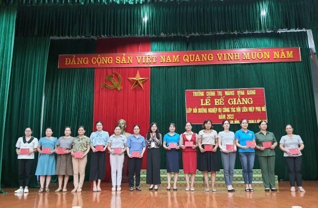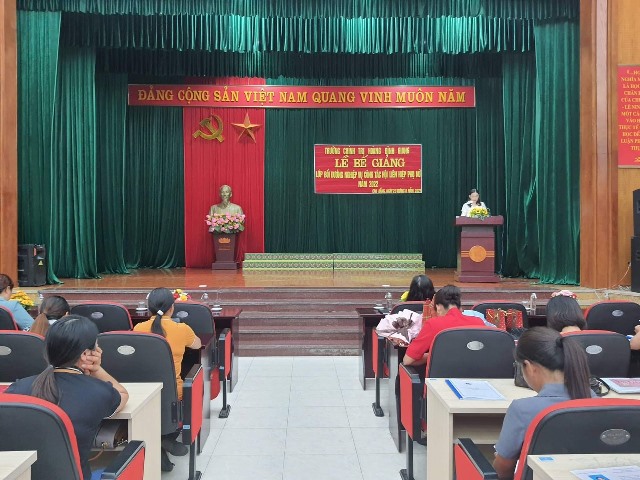 Sáng 20/8/2022, Trường Chính trị Hoàng Đình Giong tổ chức Lễ Bế giảng lớp Bồi dưỡng nghiệp vụ công tác Hội Liên hiệp phụ nữ năm 2022. Dự Lễ bế giảng có đồng chí Nông thị Tuyết – Tỉnh ủy viên, Chủ tịch Hội Liên hiệp Phụ nữ tỉnh Cao Bằng; đồng chí Trịnh Thị Ánh Hoa – Bí thư Đảng ủy, Hiệu trưởng Trường Chính trị Hoàng Đình Giong; các đồng chí lãnh đạo đại diện các phòng, ban của Hội cùng 56 học viên là Chủ tịch Hội Liên hiệp phụ nữ các xã, phường, thị trấn trên địa bàn tỉnh.