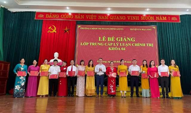 Ngày 04/10/2021, Trường Chính trị Hoàng Đình Giong tỉnh Cao Bằng phối hợp với Huyện ủy Hạ Lang tổ chức Lễ bế giảng lớp Trung cấp lý luận chính trị khóa 04 (hệ không tập trung) cho 78 học viên là cán bộ, công chức, viên chức trên địa bàn huyện. Tham dự Lễ Bế giảng, về phía Trường Chính trị Hoàng Đình Giong có đồng chí Hoàng Việt Hưng, Phó Hiệu trưởng, các đồng chí đại diện lãnh đạo các khoa, phòng của Nhà trường; về phía lãnh đạo huyện Hạ Lang có đồng chí Vũ Khắc Quang, Tỉnh ủy viên, Bí thư Huyện ủy, Chủ tịch Hội đồng nhân dân huyện, các đồng chí lãnh đạo trong Thường trực Huyện ủy, Hội đồng nhân dân, Ủy ban nhân dân huyện.