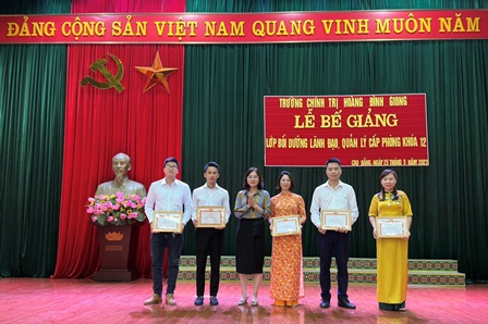 Ngày 25/5/2023, Trường Chính trị Hoàng Đình Giong tổ chức Lễ Bế giảng lớp Bồi dưỡng lãnh đạo, quản lý cấp phòng và tương đương khoá 12. Dự Lễ Bế giảng có đồng chí Trịnh Thị Ánh Hoa, Bí thư Đảng uỷ, Hiệu trưởng; các đồng chí trong Ban Giám hiệu và lãnh đạo các khoa, phòng của Nhà trường cùng 51 học viên, là cán bộ, công chức, viên chức đang công tác tại các cơ quan trên địa bàn tỉnh Cao Bằng.