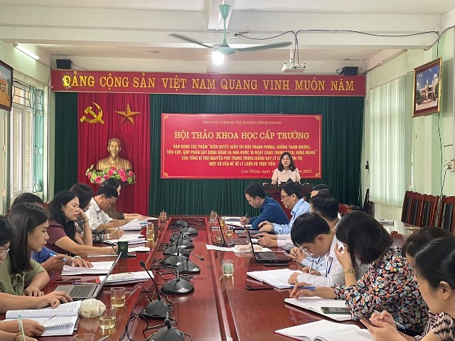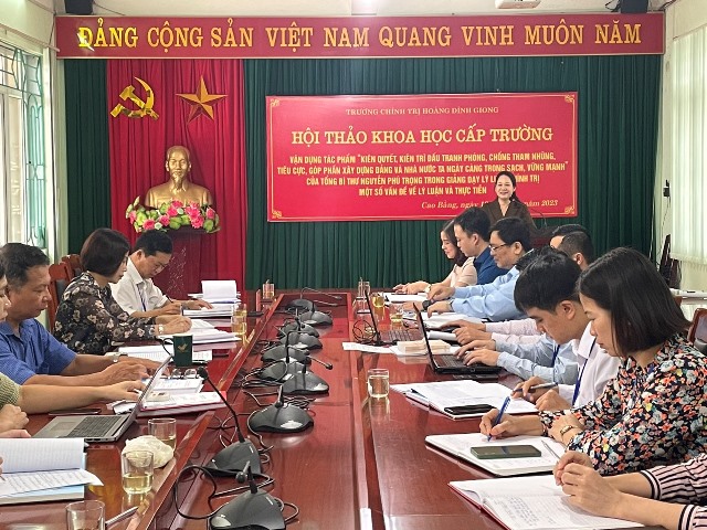 Sáng ngày 10/10/2023, Trường Chính trị Hoàng Đình Giong tổ chức Hội thảo khoa học cấp trường: Vận dụng tác phẩm “Kiên quyết, kiên trì đấu tranh phòng, chống tham nhũng, tiêu cực, góp phần xây dựng Đảng và Nhà nước ta ngày càng trong sạch, vững mạnh” của Tổng Bí thư Nguyễn Phú Trọng trong giảng dạy lý luận chính trị - Một số vấn đề lý luận và thực tiễn. Tham dự Hội thảo có chí Nông Thị Hà, Ủy viên Ban Thường vụ Tỉnh ủy, Trưởng Ban Nội chính Tỉnh ủy Cao Bằng; đồng chí Trịnh Thị Ánh Hoa, Bí thư Đảng ủy, Hiệu trưởng, Chủ tịch Hội đồng khoa học Trường Chính trị Hoàng Đình Giong; các đồng chí lãnh đạo Ban Giám hiệu Nhà trường; các đồng chí lãnh đạo phòng chuyên môn Ban Nội chính Tỉnh ủy; các đồng chí thành viên Hội đồng khoa học, cán bộ, viên chức, giảng viên Nhà trường.