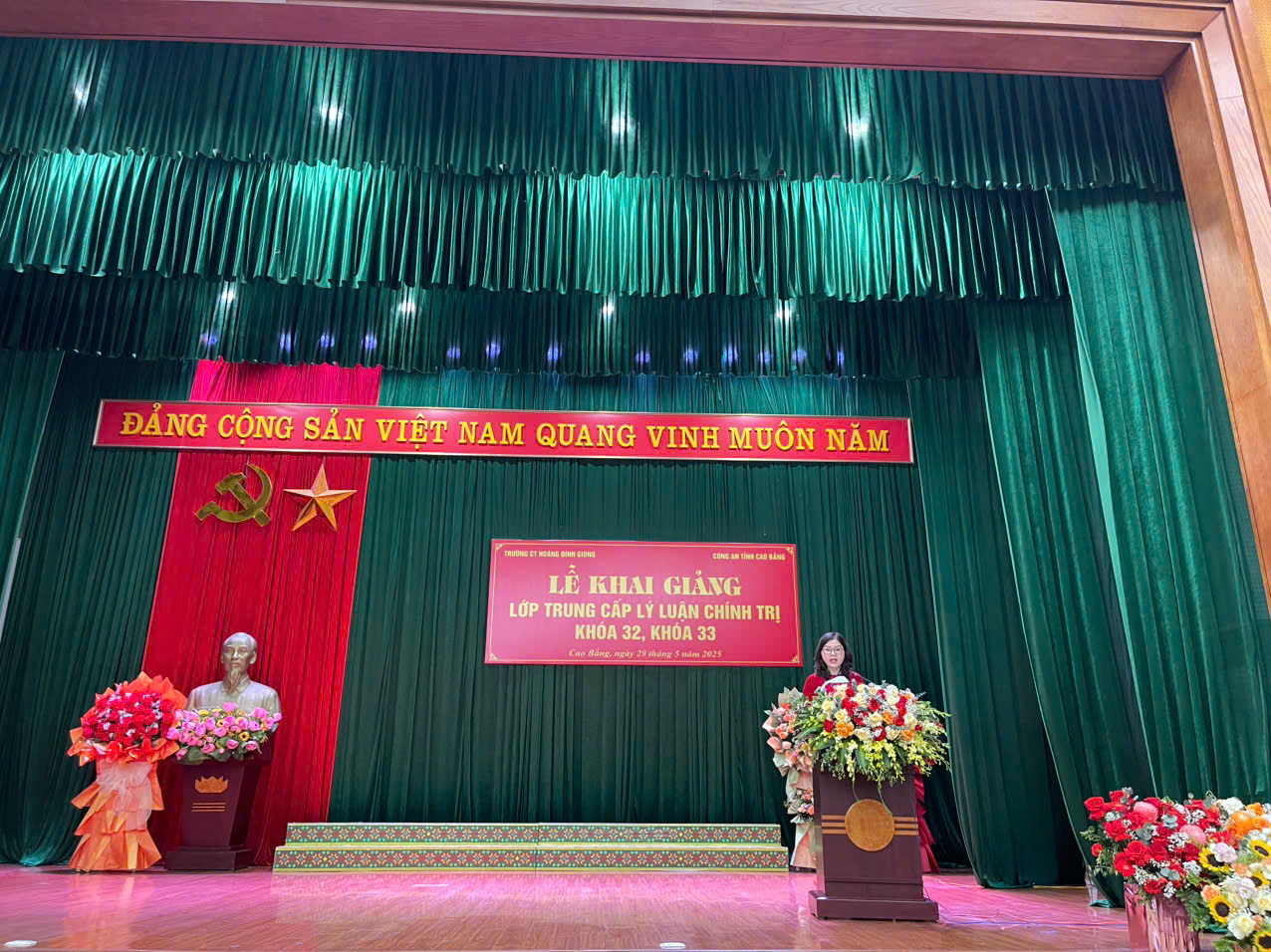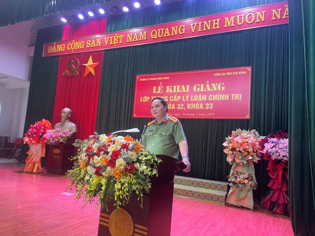 Sáng ngày 29/5/2025, Trường Chính trị Hoàng Đình Giong phối hợp với Công an tỉnh Cao Bằng tổ chức khai giảng Lớp Trung cấp lý luận chính trị khóa 32, khóa 33 cho 130 học viên là cán bộ trong lực lượng công an trên địa bàn tỉnh. Đến dự Lễ Khai giảng có sự tham dự của đồng chí Nông Quốc Tuấn, Phó Trưởng Ban Tổ chức Tỉnh ủy; đồng chí Đại tá Lương Văn Thiểm, Phó Bí thư Đảng ủy, Phó Giám đốc Công an tỉnh; đồng chí Trịnh Thị Ánh Hoa, Bí thư Đảng ủy, Hiệu trưởng; các đồng chí trong Đảng ủy, Ban giám hiệu, lãnh đạo các khoa, phòng, giảng viên Nhà trường; đại diện lãnh đạo Phòng Tổ chức cán bộ, Công an tỉnh cùng toàn thể các học viên của 02 lớp học.
