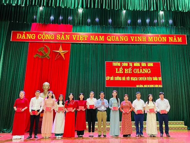 Ngày 08/5/2024, Trường Chính trị Hoàng Đình Giong tổ chức Lễ Bế giảng lớp Bồi dưỡng đối với ngạch chuyên viên khóa 105 cho 57 học viên là cán bộ, công chức, viên chức trên địa bàn tỉnh Cao Bằng. Tham dự Lễ Bế giảng có đồng chí Nông Hoàng Hùng, Phó Bí thư Đảng ủy, Phó Hiệu trưởng; các đồng chí lãnh đạo, giảng viên các khoa, phòng của Nhà trường.