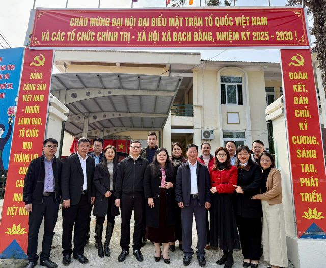 Đoàn công tác Trường Chính trị Hoàng Đình Giong và lãnh đạo xã Bạch Đằng chụp ảnh lưu niệm tại buổi làm việc