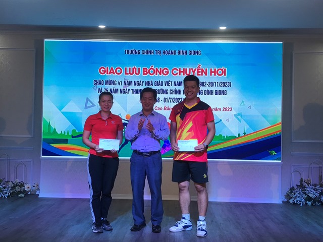 Đồng chí Nông Hoàng Hùng, Phó Bí thư Đảng ủy, Phó Hiệu trưởng Nhà trường trao giải nhất cho đội bóng chuyền hơi nam lớp Cao cấp lý luận chính trị khóa 70 và đội bóng chuyền hơi nữ