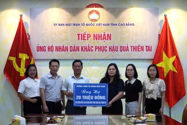 Ngày 16/9/2024, tại trụ sở Ủy ban Mặt trận Tổ quốc Việt Nam tỉnh Cao Bằng, đoàn đại biểu Trường Chính trị Hoàng Đình Giong do đồng chí Nông Hoàng Hùng, Phó Bí thư Đảng ủy, Phó Hiệu trưởng làm trưởng đoàn, đã đại diện toàn thể cán bộ, giảng viên, viên chức và người lao động Nhà trường trao số tiền 20.000.000 đồng (Hai mươi triệu đồng) ủng hộ Nhân dân tỉnh Cao Bằng khắc phục hậu quả thiên tai bị thiệt hai do cơn bão số 3 (Yagi) và hoàn lưu bão gây ra.